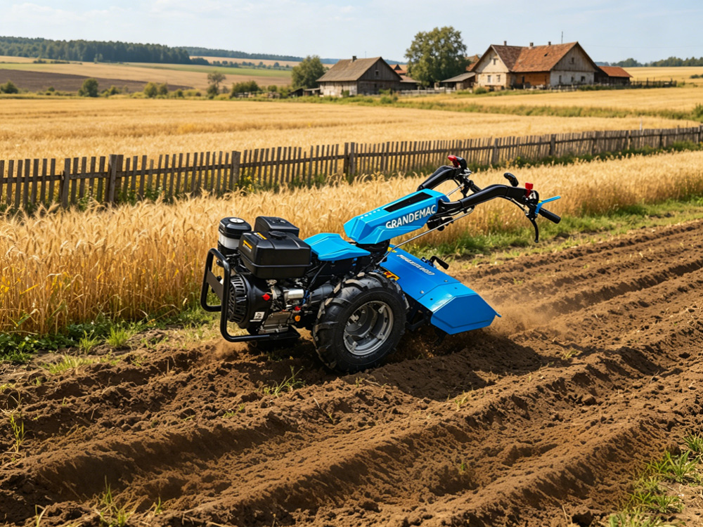 Select GRANDEMAC diesel micro tiller, equipped with rotary tillage blade set, trencher, ridge runner, weed wheel, and fertilizer applicator, to achieve multi-purpose use of one machine